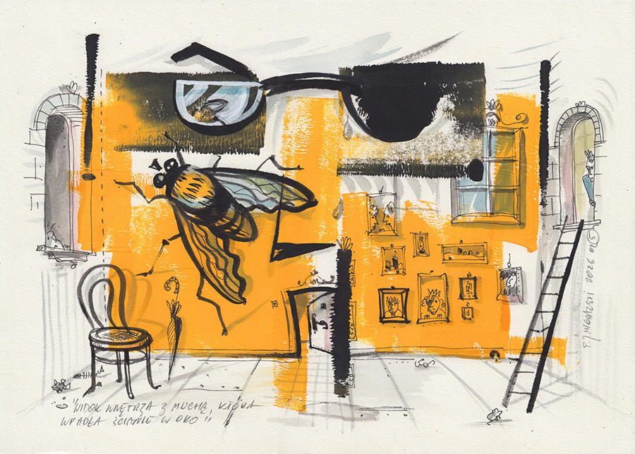 Widok wnętrza z muchą, która wpadła ścianie w oko
